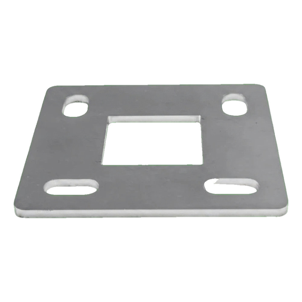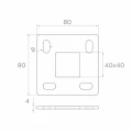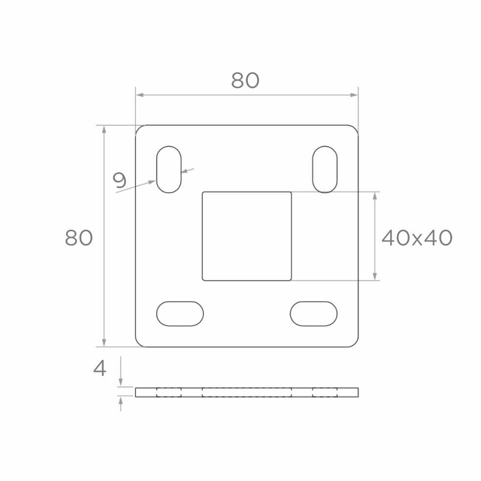 Cuatro orificios ovalados de montaje (9×20 mm) proporcionan flexibilidad al anclar al suelo — el ajuste de la posición de los tornillos facilita la alineación precisa del pilar incluso en superficies irregulares. El orificio central 40×40 mm está adaptado al sistema estándar de perfiles cuadrados, lo que garantiza compatibilidad con pilares de balaustrada populares.