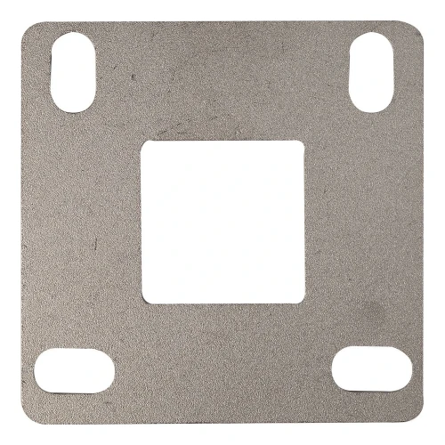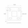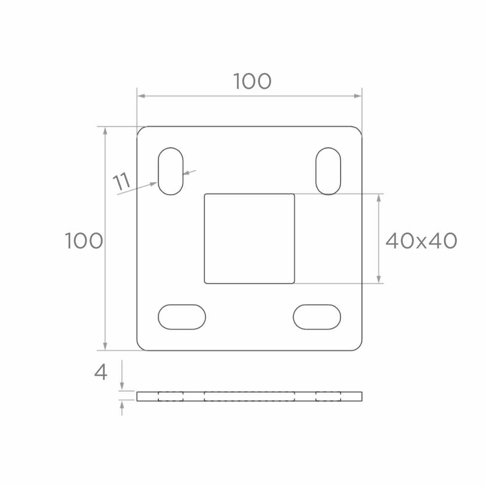 La base tiene un orificio central cuadrado 40x40 mm adaptado al perfil del poste y cuatro orificios de montaje tipo ovalado (11x20 mm), que permiten un ajuste preciso de la posición durante el atornillado al suelo. La superficie en bruto (sin tratamiento adicional) permite soldar sin necesidad de eliminar recubrimientos — lista para trabajar nada más sacarla del embalaje.