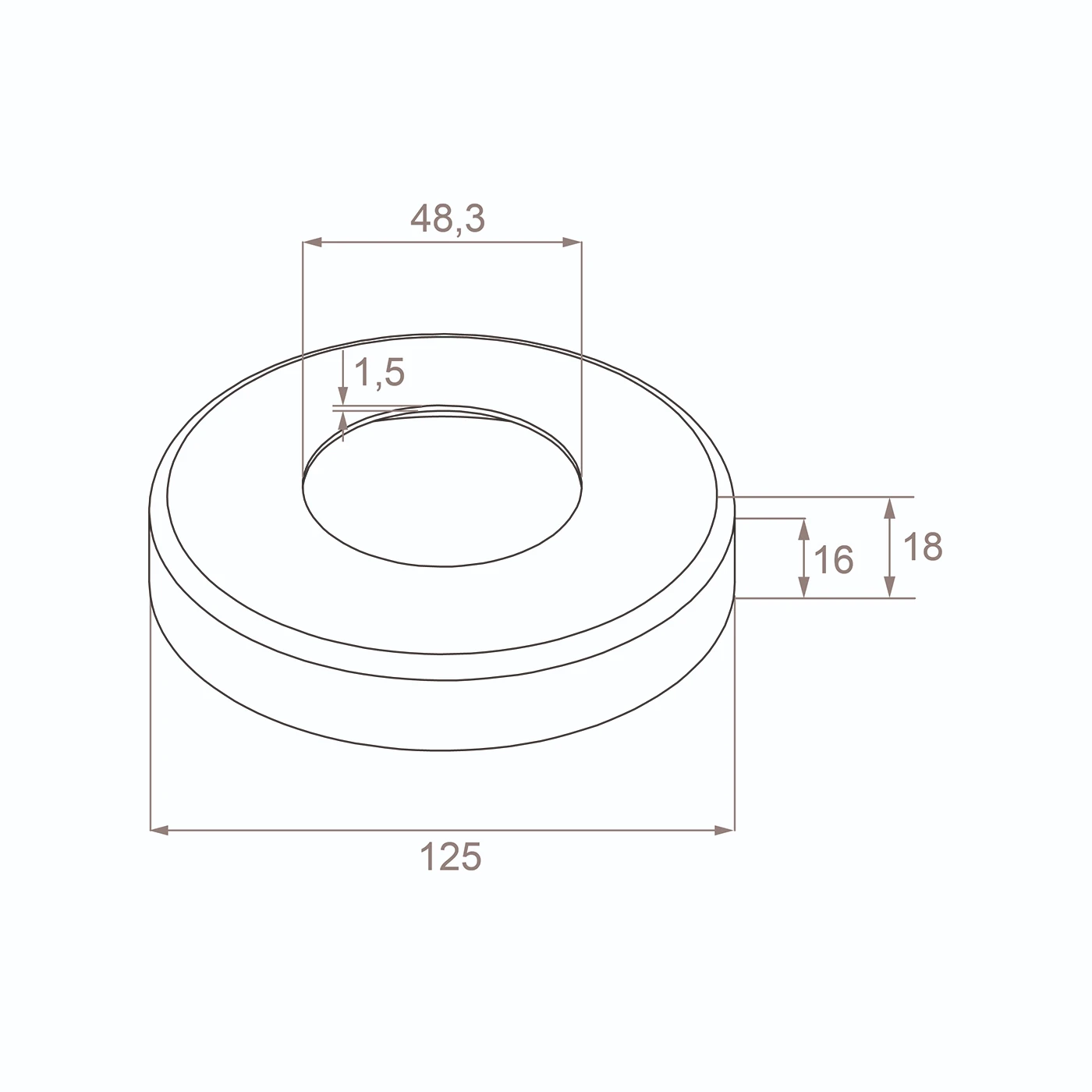 Embellecedor circular Ø 125 mm diseñado para tubo de diámetro 48,3 mm — elemento estético de acabado que oculta orificios de montaje en barandillas de acero inoxidable. Gracias al ajuste preciso al sistema de tubos 48,3 mm garantiza un aspecto profesional y limpio de cualquier construcción de barandilla.