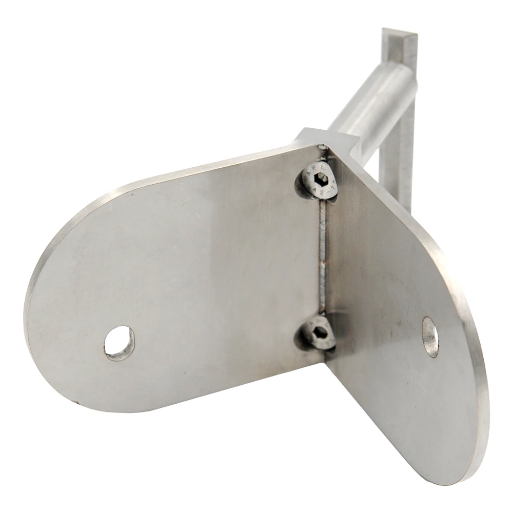 La construcción se compone de una placa de montaje fijada a la pared o superficie y dos espárragos separadores que mantienen el poste a una distancia de 50 mm de la superficie de montaje. Esta geometría permite un asentamiento seguro del poste en la esquina, eliminando la necesidad de utilizar adaptadores angulares adicionales. Los orificios de montaje en la placa permiten un atornillado rápido y preciso al soporte.