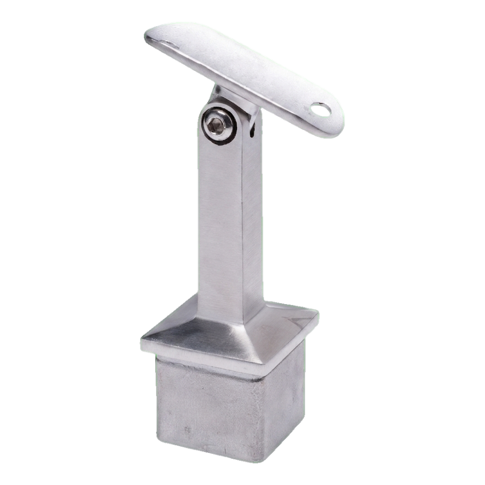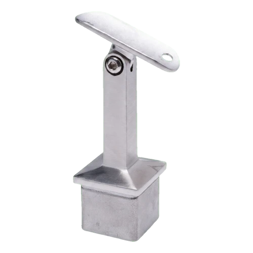 Soporte de pasamanos articulado destinado a la unión de poste cuadrado 40×40 mm con pasamanos de diámetro 42,4 mm en construcciones de barandillas de acero inoxidable. Gracias a la articulación regulable, el elemento permite el ajuste libre del ángulo de inclinación del pasamanos, lo que es especialmente útil en el montaje de barandillas de escalera — elimina la necesidad de cortes y ajustes angulares en obra.
