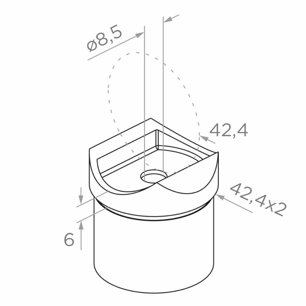 El soporte se monta transversalmente — encolado en el interior del poste de diámetro 42,4 × 2 mm mediante pegamento anaeróbico. La silla perfilada en la parte superior se adapta perfectamente al tubo del pasamanos Ø42,4 mm, garantizando el contacto completo y la estabilidad de la conexión. El orificio de montaje Ø8,5 mm permite un refuerzo adicional con tornillo, si las condiciones de montaje lo requieren.