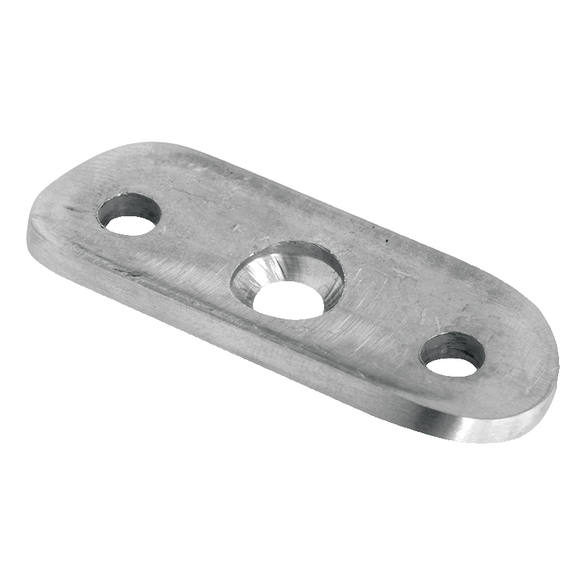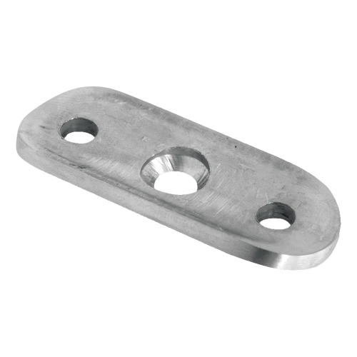 Placa de montaje para pasamanos destinada al sistema de barandilla de ⌀ 48,3 mm. Permite un montaje rápido y seguro del pasamanos desde arriba, directamente sobre superficie plana – por ejemplo, a un poste de barandilla u otro elemento portante. Tres orificios de montaje (dos extremos achaflanados para tornillos de cabeza cónica y uno central) garantizan una fijación estable de tres puntos y un aspecto estético de la unión.