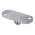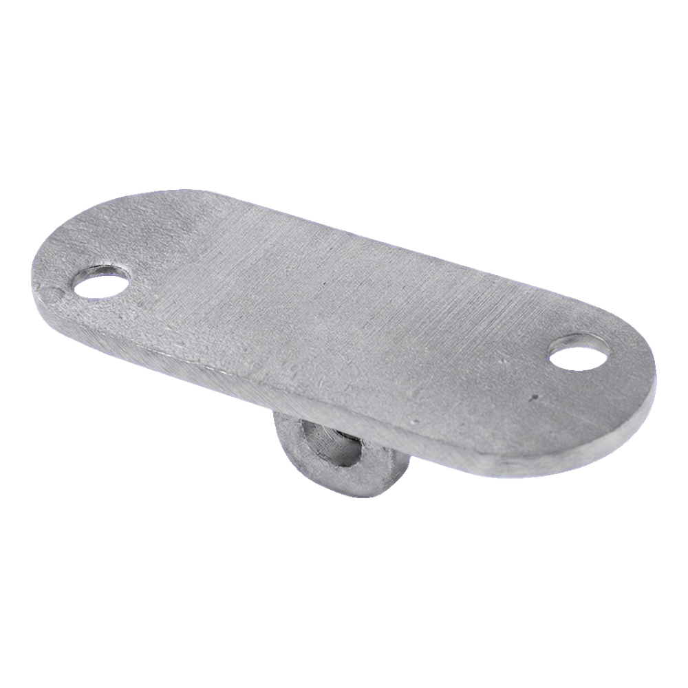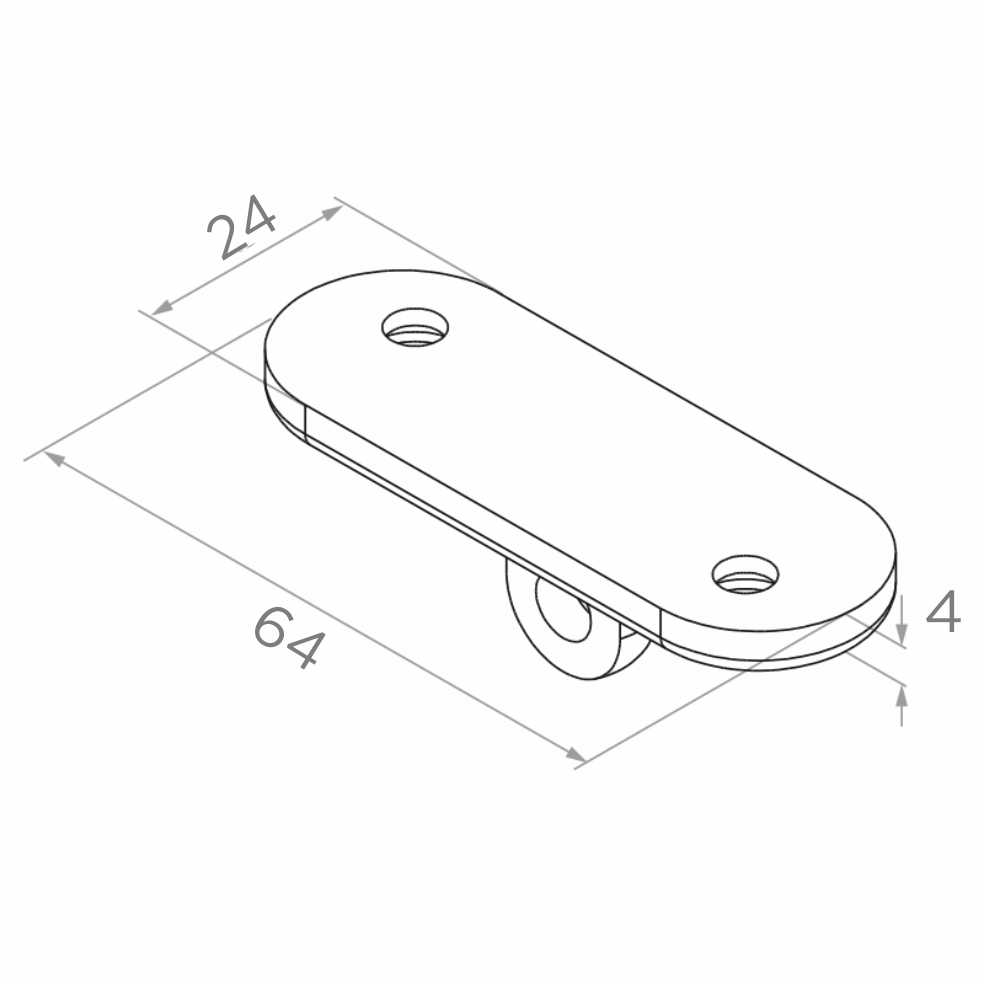 La pletina dispone de dos orificios de montaje en la placa superior plana y una sujeción articulada inferior que se conecta con el elemento del poste u otro componente del sistema de balaustrada. Las dimensiones compactas (64×24×4 mm) y el bajo peso (0,03 kg) hacen que el elemento no sobrecargue la estructura y sea fácil de almacenar y transportar. El acabado satinado de la superficie armoniza con otros elementos del sistema plano de acero inoxidable.