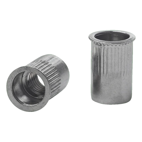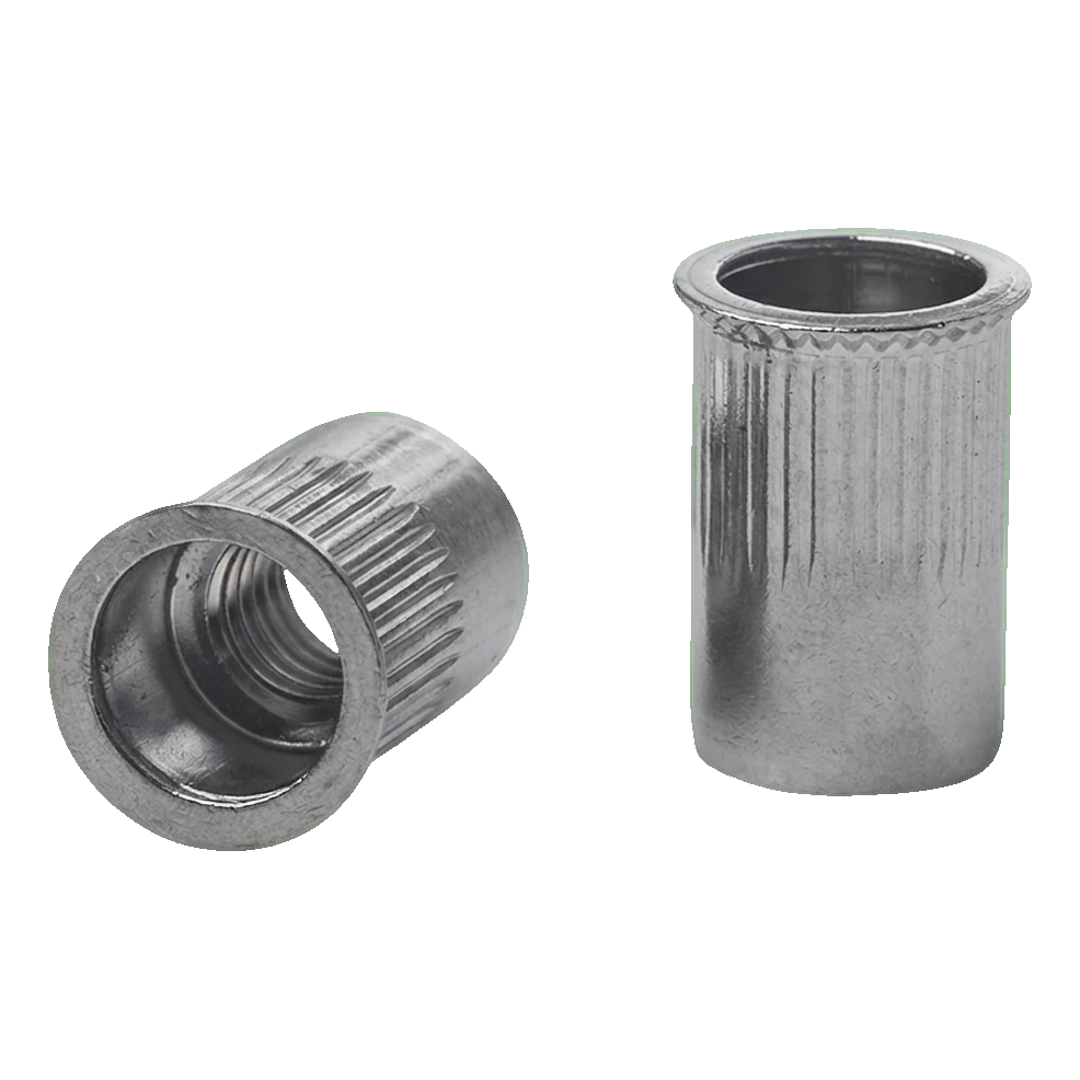 Tuerca remachable pasante M6 A2 AISI 304 – brida cónica reducida, moleteada