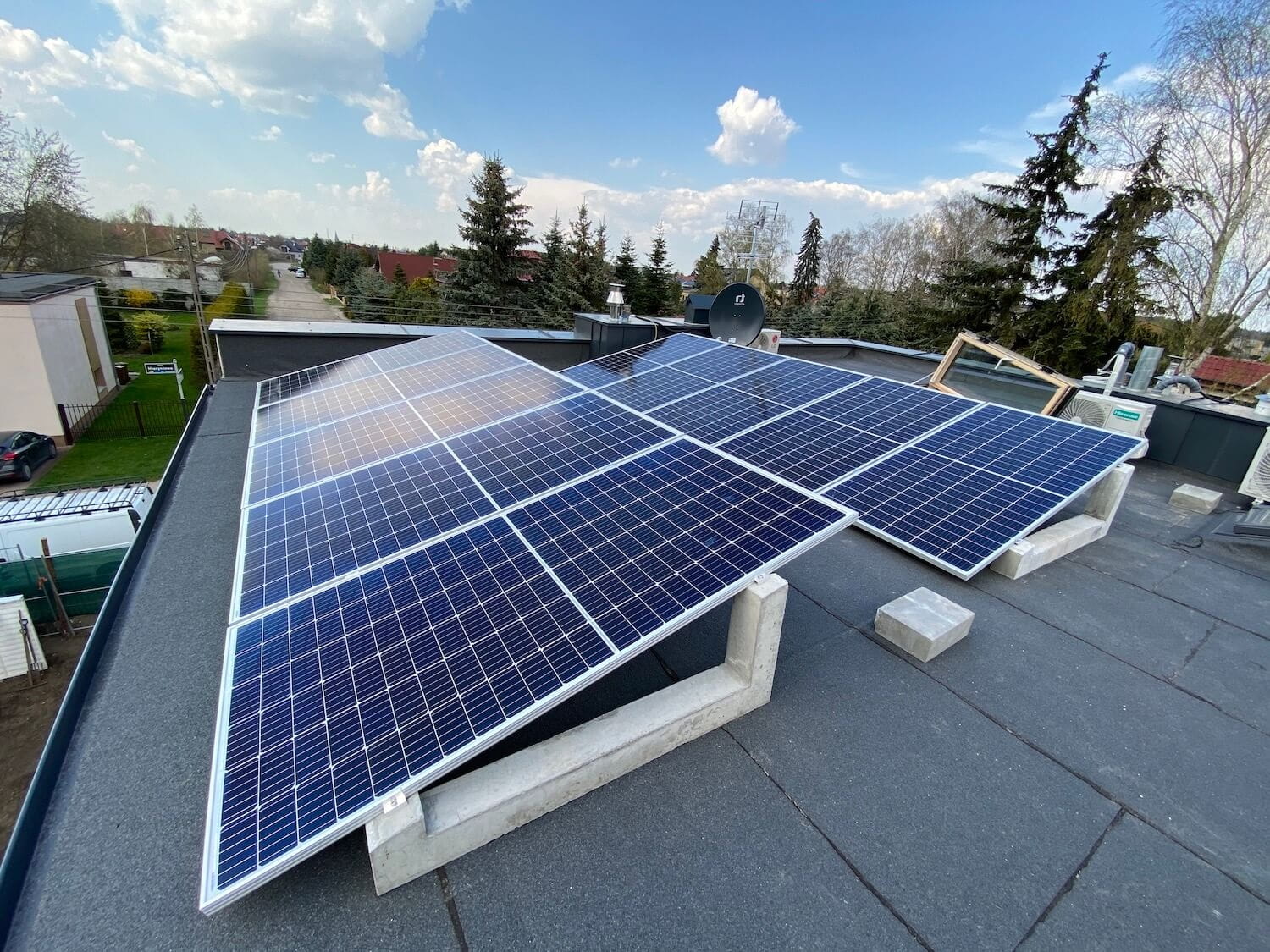 Montaje sin perforación – los bloques de lastre eliminan la necesidad de perforar el revestimiento de la cubierta. El peso del hormigón garantiza un anclaje estable de los paneles incluso con viento fuerte, protegiendo la instalación de daños mecánicos.