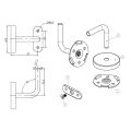 El soporte está compuesto por cinco elementos: base de montaje para pared, brazo en forma de L con doblez de 90°, soporte (chapa de montaje de barandilla), tornillo con cabeza cónica y rosetón de embellecimiento. El embellecedor de diámetro 70 mm cubre la base de montaje y da al conjunto un aspecto elegante y limpio.
