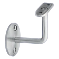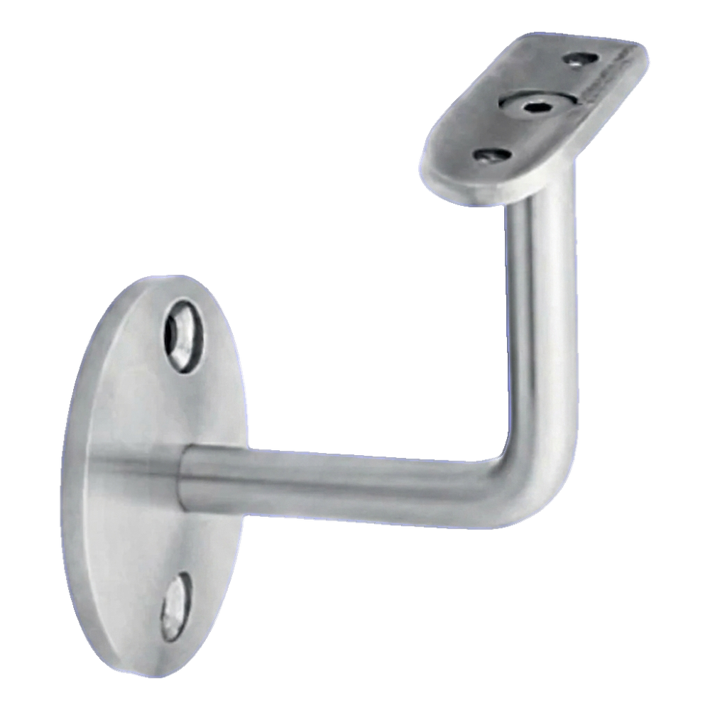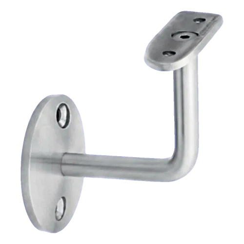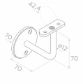 El soporte está compuesto por una roseta de montaje circular con dos orificios de fijación, un brazo en forma de L de varilla de ø12 mm de diámetro y una silleta (chapa con orificios de montaje) que constituye el soporte de la barandilla. La construcción proporciona un apoyo estable y seguro, y la superficie pulida otorga a las balaustradas un carácter elegante y profesional.
