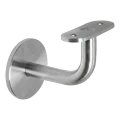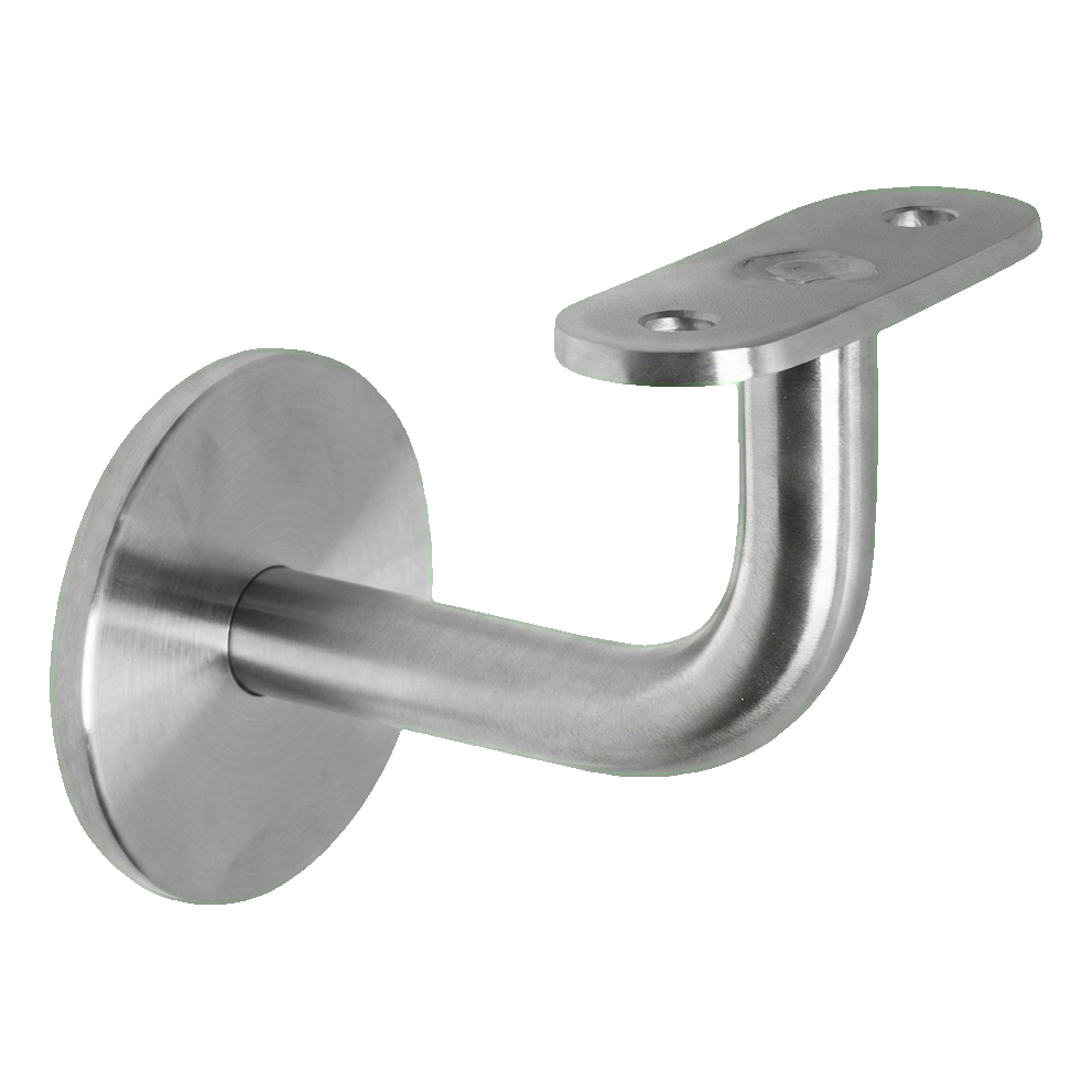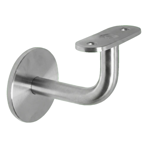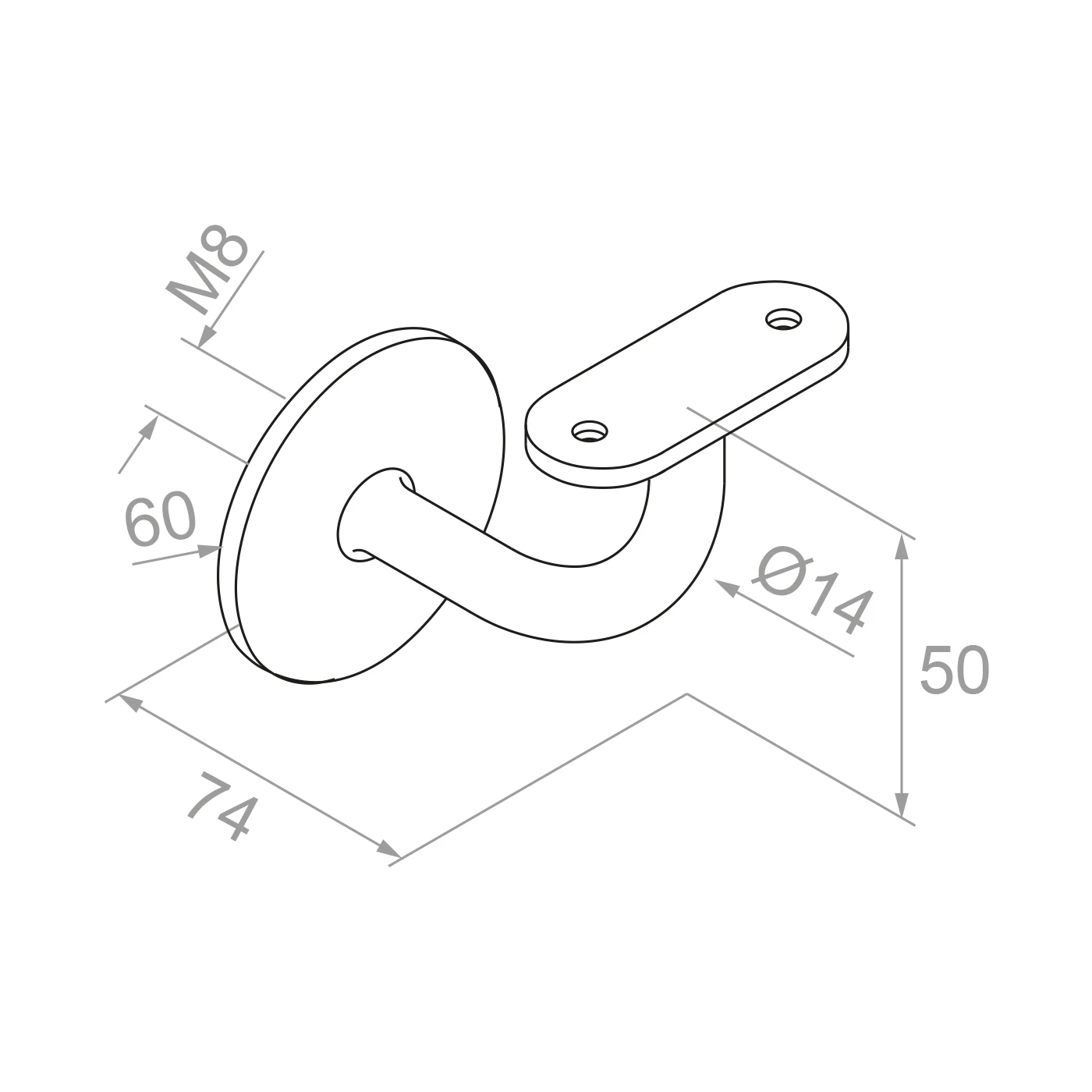 El soporte consta de una roseta de pared circular, una varilla portante curvada de diámetro Ø14 mm y una chapa de montaje plana con orificios, que facilita el atornillado del pasamanos. La chapa de montaje está incluida en el conjunto. El montaje a la pared se realiza mediante tornillo M8 (el tornillo no está incluido en el conjunto).