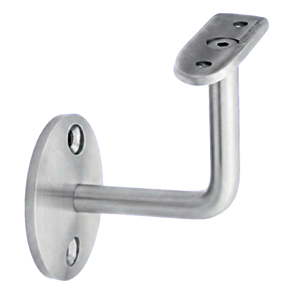 El soporte consta de una roseta de montaje circular fijada a la pared mediante dos orificios de montaje, un brazo portante en forma de L y una silla perfilada adaptada a la curvatura del tubo del pasamanos. El conjunto forma una construcción rígida y estable que garantiza la seguridad de uso de la barandilla.