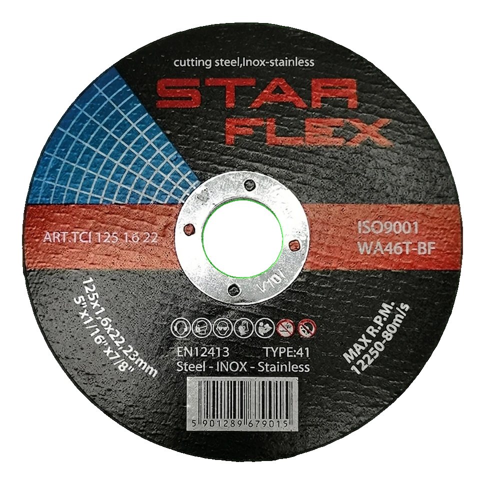 El disco de corte Star Flex 125×1,6 mm es una herramienta diseñada para el corte preciso de acero al carbono, inoxidable (INOX) y resistente a ácidos. Gracias a su perfil delgado de 1,6 mm garantiza un corte rápido y sin rebabas con un mínimo de material adicional, lo que se traduce directamente en menores costes de mecanizado y menor tiempo de trabajo en la instalación.