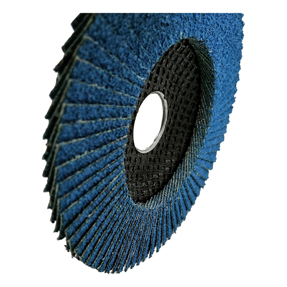 El disco en versión plana (flat) ofrece mayor superficie de contacto con el material mecanizado. Gracias a esto es ideal para operaciones que requieren menor presión y mayor control, por ejemplo, alisado de grandes superficies planas. El ángulo óptimo de trabajo es de 0–15° respecto a la superficie, lo que la convierte en una excelente elección para el lijado de chapas, perfiles y elementos de construcción de acero en posición plana.