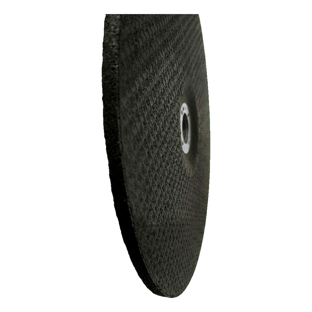 El disco tiene un perfil central cóncavo (tipo 27), gracias al cual la superficie de trabajo no interfiere con la tuerca de fijación de la amoladora. La malla de refuerzo de fibra de vidrio visible desde la parte trasera refuerza la estructura abrasiva y protege contra la desintegración del disco a velocidades de trabajo.
