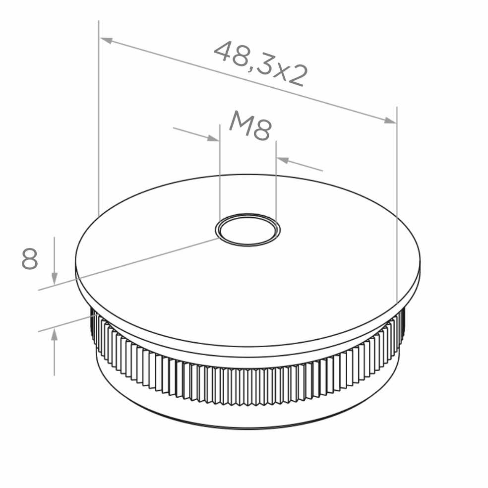 El tapón convexo a presión es un elemento que enmascara las aberturas en los tubos de barandilla de acero inoxidable. Gracias al ajuste preciso al tubo de diámetro 48,3 mm, el montaje consiste en simplemente presionar el tapón en el interior del perfil — sin soldadura ni pegado. La rosca central M8 permite el posterior montaje de soportes de pasamanos, bolas decorativas u otros elementos de remate, lo que proporciona gran flexibilidad en el diseño de barandillas de balcones, terrazas y escaleras.