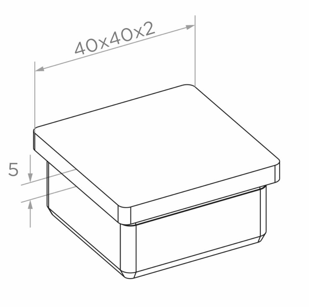El tapón constituye un acabado estético para pasamanos y postes de barandillas de acero inoxidable fabricados con perfiles cuadrados 40×40 mm. Gracias al montaje por impacto la instalación es rápida y no requiere herramientas adicionales — basta con un martillo de goma. El acabado satinado elimina la necesidad de tratamiento adicional tras el montaje y garantiza un aspecto uniforme con el resto de elementos del sistema de barandilla.