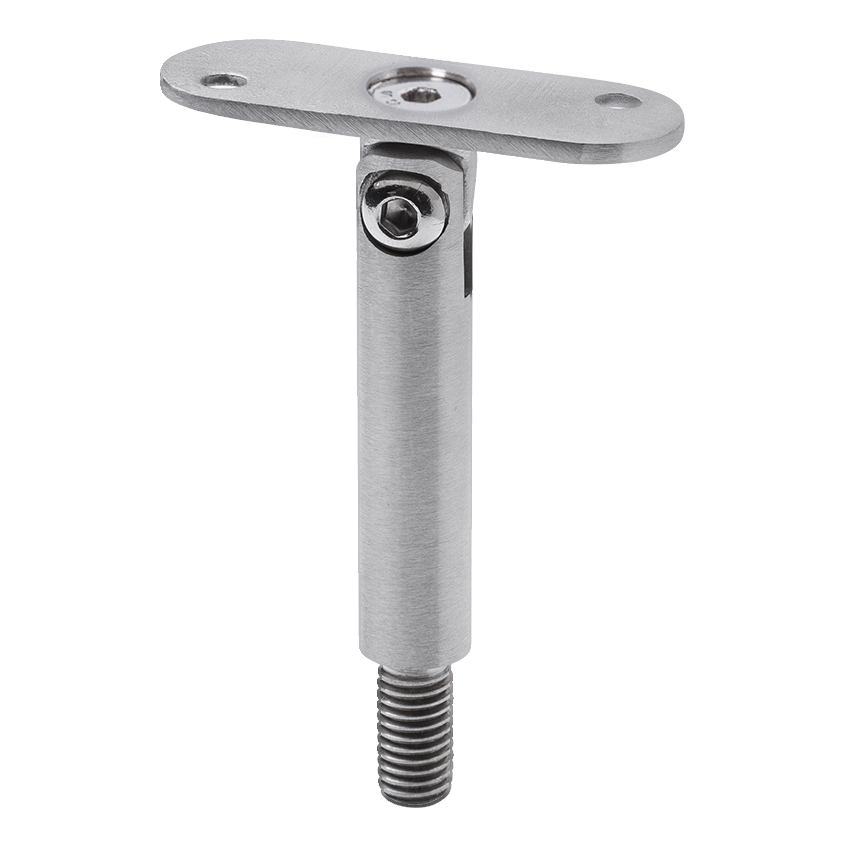 La varilla articulada está destinada al montaje en sistemas de barandillas de acero inoxidable — especialmente en barandillas de escalera, donde se requiere un cambio en el ángulo de conducción del pasamanos. La articulación permite un ajuste fluido de la inclinación de la pletina de montaje respecto al eje del vástago, de modo que el pasamanos discurre paralelo a la línea de los escalones sin necesidad de utilizar elementos angulares adicionales. Es ideal en cualquier lugar donde el instalador necesite una conexión flexible poste-pasamanos: escaleras, entrepisos, rellanos y galerías.